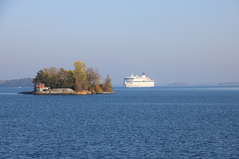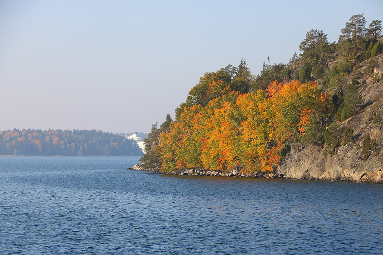 Härligt att i medvinden sitta på soldäck och njuta av höstens härliga färger, som på denna bild är framträdande på södra delen av Stora Timrarö. På håll syns en del av Birka – fartyget alltså.