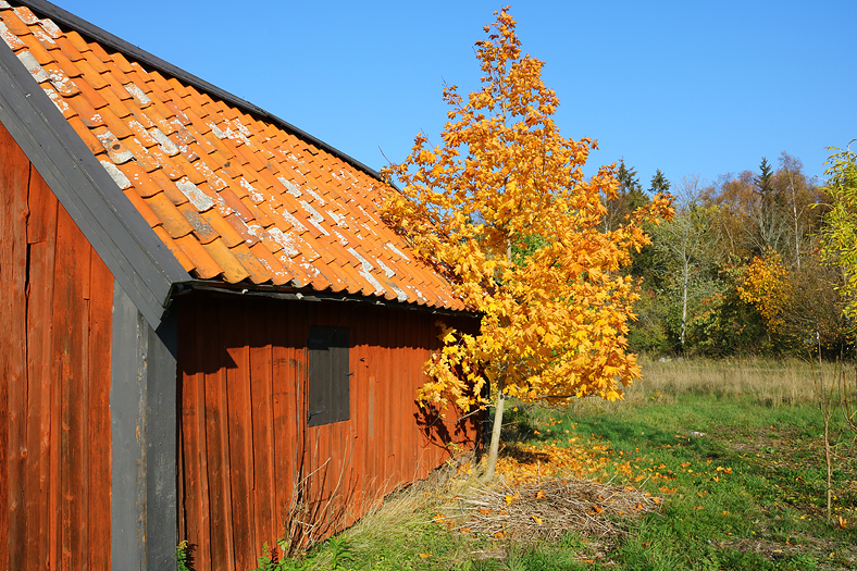 Röd byggnad, gula höstlöv och blå himmel – det är väl den perfekta kombinationen.