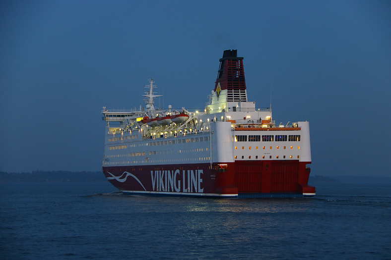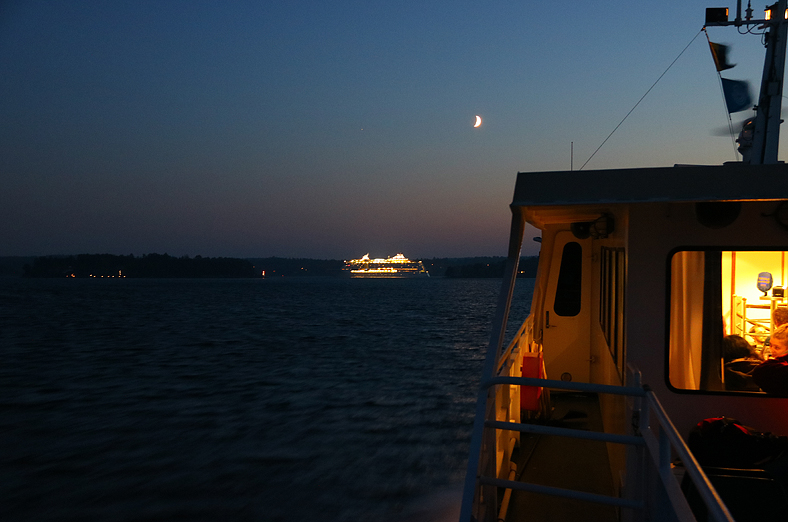 Norr om Siarö lämnas Furusundsleden för att gå in mot Vättersö och senare alla bryggor längs Yxlan och Blidö. Bilden visar Norrholmen och färjan Viking Cinderella i ett ganska så skönt ljus.