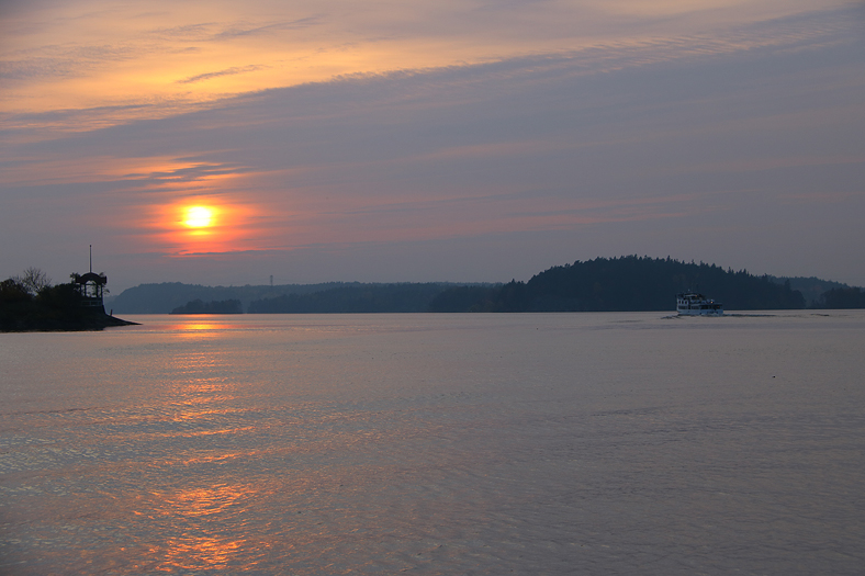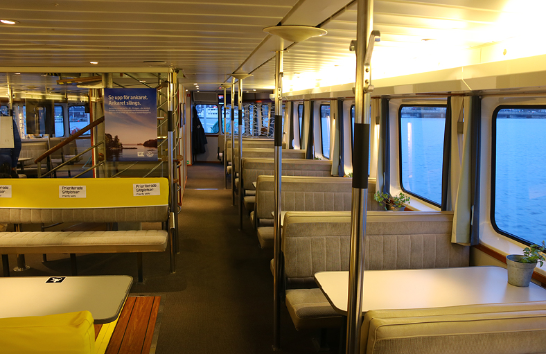 Ingen jättemängd resenärer som åkte inåt stan på denna tur, även om det inte var lika folktomt som bilden visar. Några åkte tur och retur Ekensberg, satt kvar på soldäcket i det vackra solnedgångsljuset.