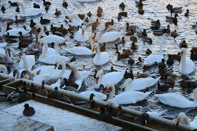 Fåglarnas svar på T-Centralen…Intill Strömbrons västra sida finns under vinterhalvåret en utfodringsplats för fåglar, och nog kommer många hungriga gäster till buffén.