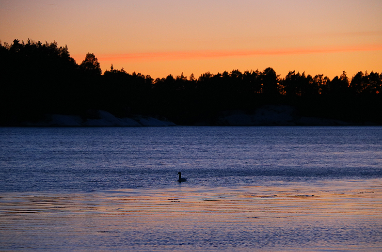 Stämningsfullt, en svan kommer simmande i skymningsljuset.