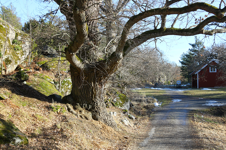På bilden har jag tagit mig ut till den yttre, östligaste delen av Björnö, och gått in på en stig som sedermera skulle leda mig fram till ett utsiktstorn. Passerade ett fint torp längs vägen med härliga ekar intill.