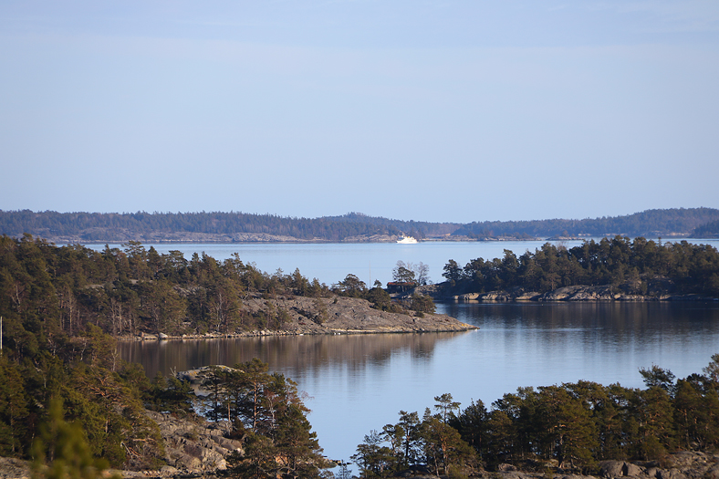 Utsikt bort mot arkipelagen norr om Nämdö, där just här på bilden skärgårdsbåten med namnet Nämdö syns på håll.