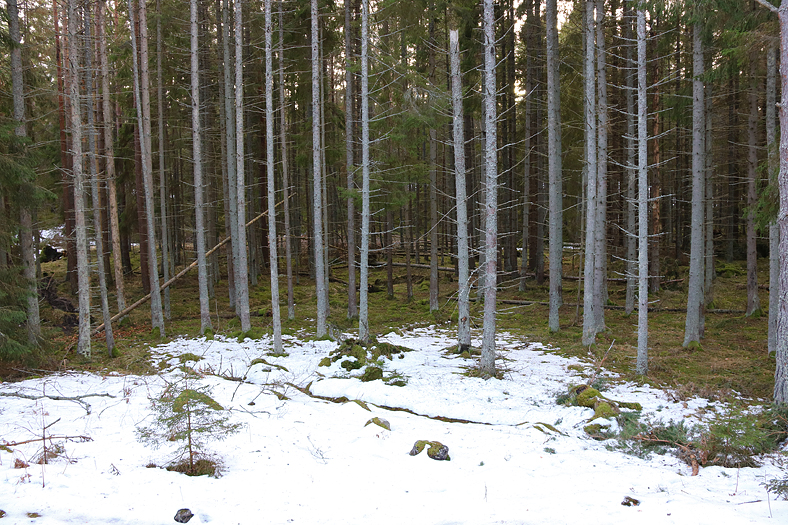 Snö mot skog. Den snö som fanns låg rätt utspridd, och framför allt då i partier där solen inte kommer åt så lätt. I skogen syntes ett och annat fallet träd i spåren efter stormen Alfrida som härjade för någon månad sedan.