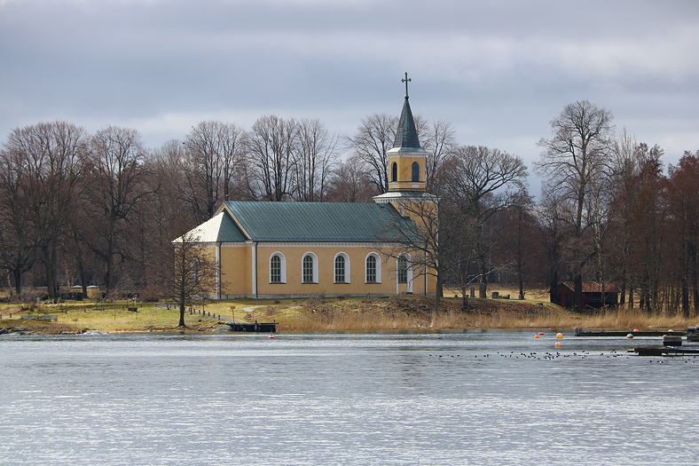 Från fåglar till en byggnad nära stranden i innersta delen av Kyrkviken, och naturligtvis är det ju då Utö kyrka, invigd år 1850. Tillhör ”treenigheten” Dalarö-Ornö-Utö församling.