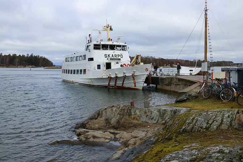 Lågsäsong går den mesta trafiken till Utö ifrån Årsta havsbad. Pendeltåg till Västerhaninge, och därefter busslinje 846 till hållplats Årsta brygga. 10:20 var avgångstid för m/s Skarpö, som gått in i trafik istället för ordinarie båten Waxholm II.