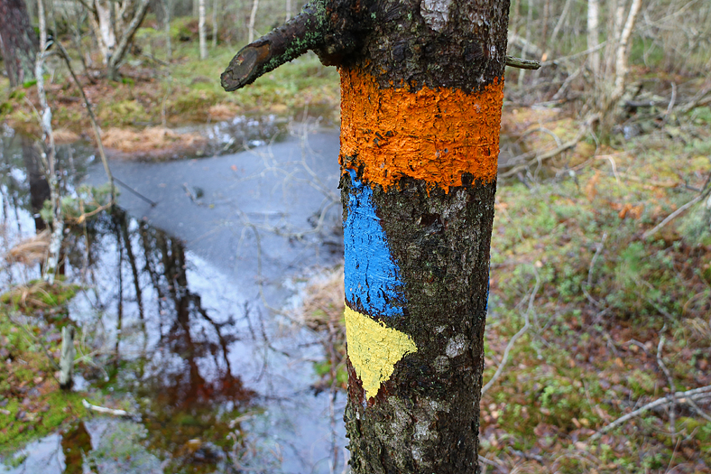 Vi gick stora vägen från Spränga i riktning mot Gruvbyn, men så passerade vi en informationsskylt om gamla ryssugnar som vi tänkte kolla in. Ryssugnarna missade dock vi, men vi kom ändå in på en fin naturstig som tog oss bort till en tältplats, i utkanten av Gruvbyn. Naturstigen markerades tydligt med gulblå färg.