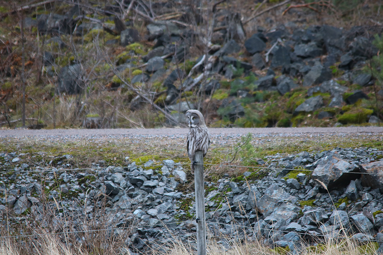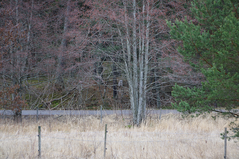 Så uppmärksammade Niclas mig på att det satt någon stor fågel på andra sidan av en hage, inte så långt ifrån värdshuset uppe i Gruvbyn. Jag tänkte ”va fasen kan det vara”…Och den tanken var väl rätt befogad, då den stora fågeln var en lappuggla! Absolut ingen förväntad syn, men det händer att lappugglor under vintertid söker sig söderut för att hitta föda i form av sork, då till trolig orsak av brist på sorkar i dess levnadsområde norröver, och tydligen hade en individ sökt sig till Utö!