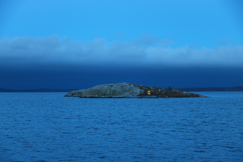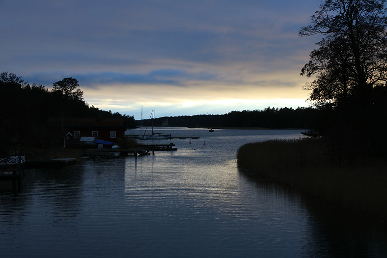I den blåa timmen for vi över Mysingen tillbaka till Årsta.