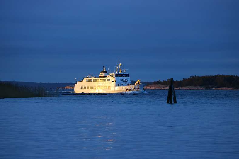 Allt har sitt slut, så även ett besök på Utö. Några minuter innan 17:30 så hördes det karaktäristiska ljudet från m/s Skarpö, som sedan dök upp bakom Stora Persholmen, i den för dagen ändå rätt sällsynta solljuset. Solnedgången blev inte mer effektfull än det här.