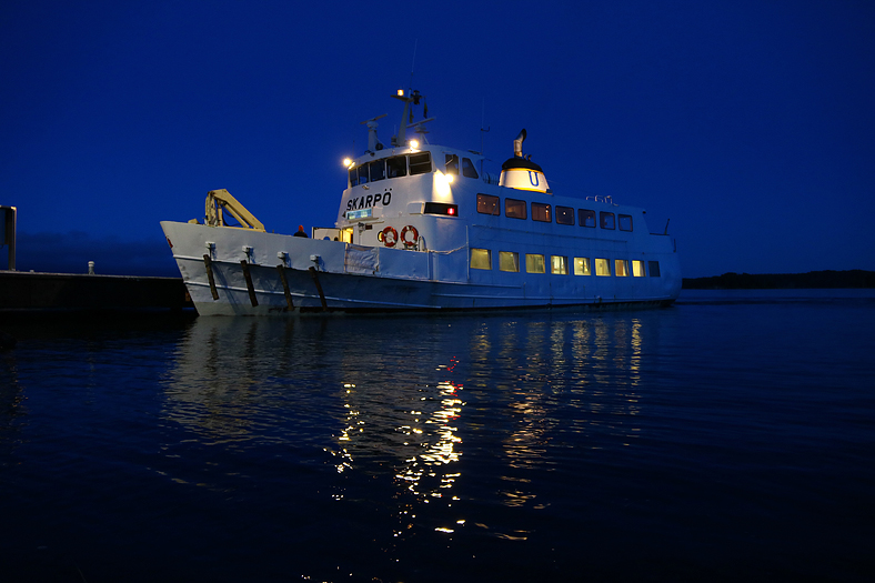 Ännu en vinkel på Ö-båten Skarpö. Byggdes en serie isgående fartyg för Waxholmsbolaget år 1964-1965, en fartygsserie på tre båtar med namn efter öar nära Vaxholm – Tynningö, Ramsö och Skarpö. Alla tre byggda på ett varv i Kristinehamn, i Värmland. Varvet brann ner inför leveransen av just m/s Skarpö, men än 54 år senare så kämpar Skarpö på i reguljär trafik.