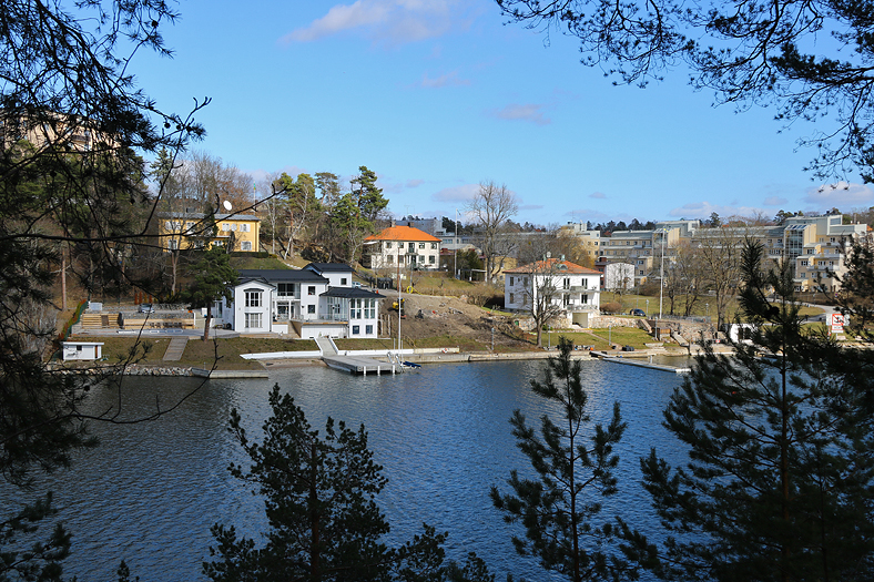 Från Bergshamra centrum tog jag mig ner mot vattnet till. En fin gångväg vid vattnet, i till stora delar skogsparti, kom jag att gå bort till Ulriksdals slottsområde. Bilden visar området Inverness på Danderydssidan av Stocksundet.