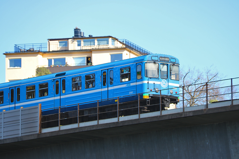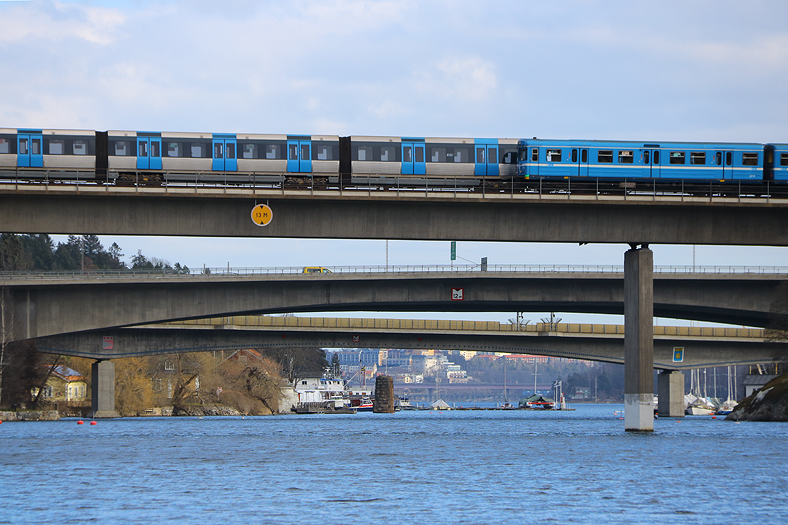 Möte på tunnelbanebron över Stocksundet. Ett C20-tåg möter ett Cx-tåg. Snart kommer det ytterligare en modell in i trafik, C30, som ska ersätta de äldsta tågen. På denna bild syns de tre Stocksundsbroarna, och långt i fjärran på bilden syns de två Lidingöbroarna, varav en jag kom att gå över senare.