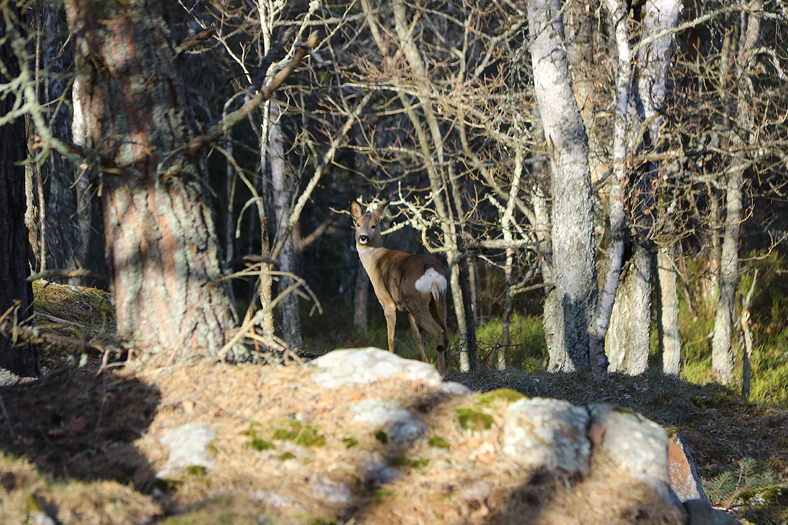 Norra Djurgårdens härliga natur gick jag in i, efter att ha gått en kort bit längs den ur naturupplevelse mindre smickrande vägen E18. Inne i skogen på en höjd, i närheten av Stora Skuggan, mötte jag ett rådjur.