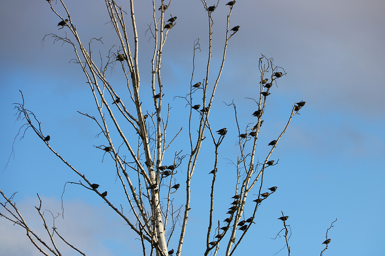 På ett träd vid Fisksjöängen hördes en kör från dessa starar.