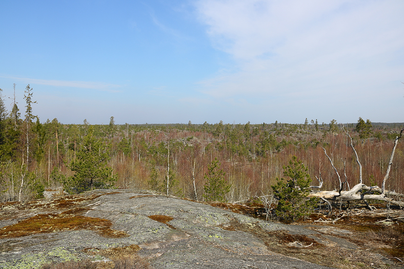 Efter Bylsjön gick jag vidare mot Stensjön. Väl uppe på hällmarken, efter några minuter på en skogsväg, kom sedan vyn av det öppna brandområdet fram. Ödeläggelsen från 1999 på över 400 hektar, som dock har skapat nya liv i växt och djurriket. Även om exempelvis en hel del spelplatser för skogsfågeln tjäder försvann.