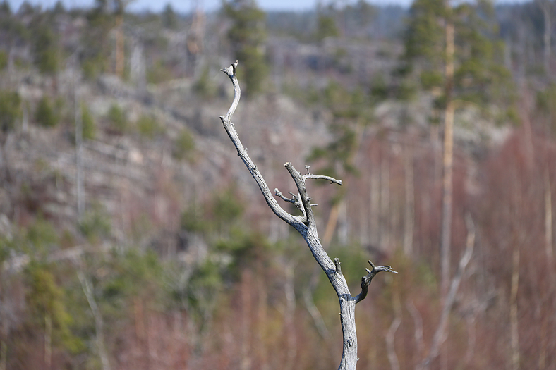 Efter Bylsjön gick jag vidare mot Stensjön. Väl uppe på hällmarken, efter några minuter på en skogsväg, kom sedan vyn av det öppna brandområdet fram. Ödeläggelsen från 1999 på över 400 hektar, som dock har skapat nya liv i växt och djurriket. Även om exempelvis en hel del spelplatser för skogsfågeln tjäder försvann.