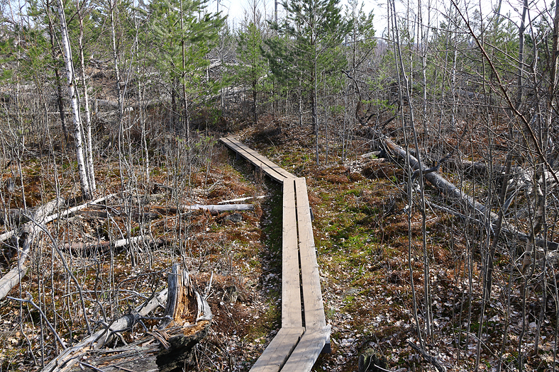 På en del ställen ligger spångar utlagda, så att man lättare ska kunna komma fram. Ganska rotigt underlag på en hel del ställen.