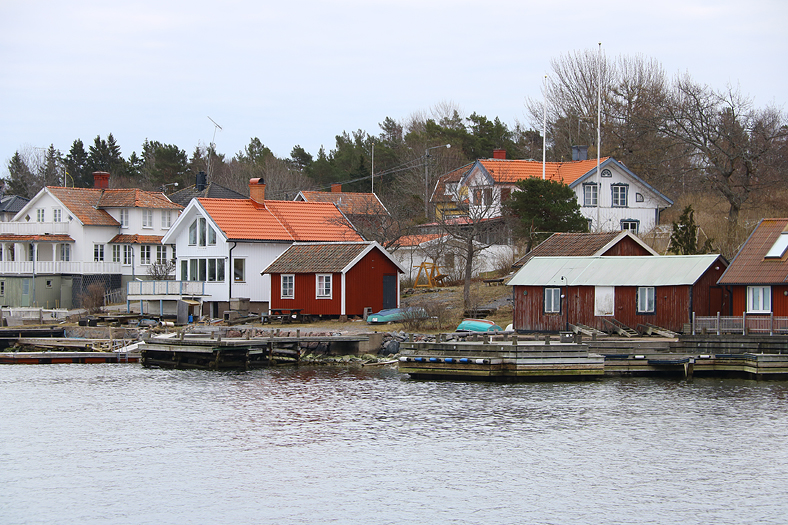 Strax efter halv tio lämnade Yxlan Furusund för vidare färd ut i arkipelagen. Bilden här visar bebyggelse vid Köpmanholm, en by på nordligaste delen av den avlånga ön Yxlan. Och passande nog så fotograferades då en bit av ön Yxlan ifrån båten Yxlan. 😉