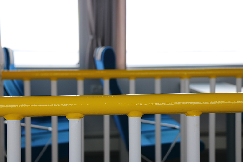 Interiör i detalj. Välkänd gul färg på räckena från tunnelbana och pendeltåg exempelvis.