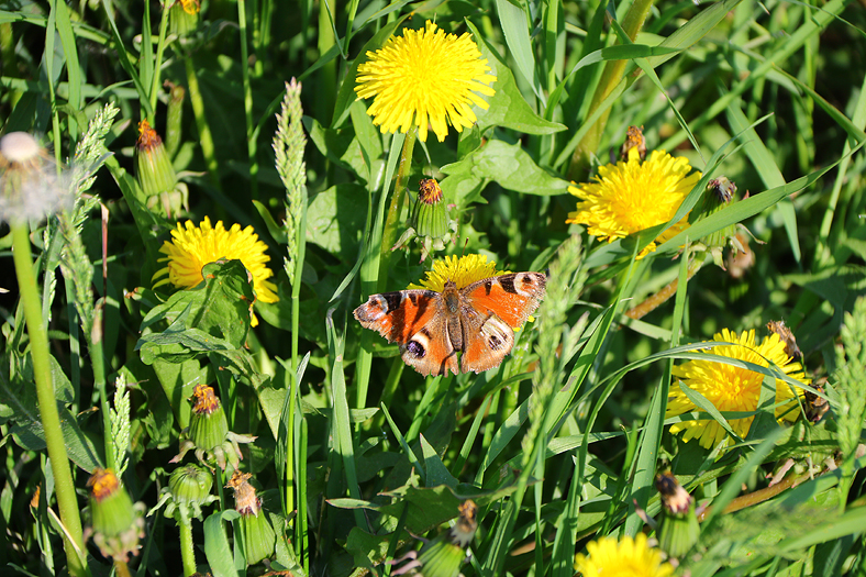 Påfågelöga bland maskrosor nära Svartbäcken, Haninge, där min vandring startade ca 08:20 på nationaldagsmorgonen.