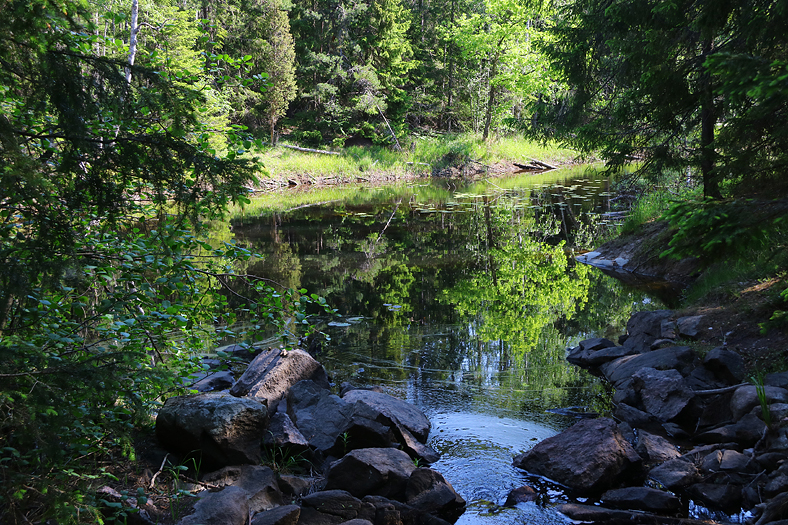 Efter att gått ner från hällmarken så nåddes den här trolska miljön vid ett vattendrag nära Stensjön, där spår av bäver syns på en del håll.