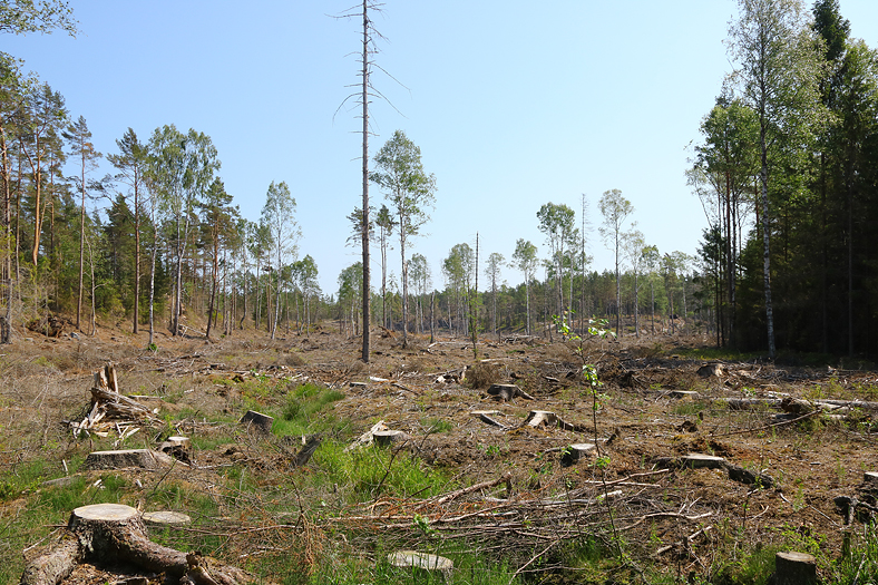 Den marken som åsyftas är produktionsskog och odlingsmark till stor del. Ett större kalhygge kom jag att passera på väg mot Dalarö. Här gick jag förra året på samma ställe men i ett djup skog istället, inte helt lätt att känna igen sig faktiskt. 😉