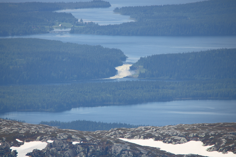 Tännforsen är Sveriges största vattenfall med en fallhöjd på totalt 37 meter, där 26 av dem är det lodrätta fallet. Fotograferat i fågelväg 17 kilometers avstånd, så sikten uppifrån berget var god denna söndag. Och trots avståndet till vattenfallet så såg det mäktigt ut, det ligger inom ett naturskyddat område vid Indalsälven.