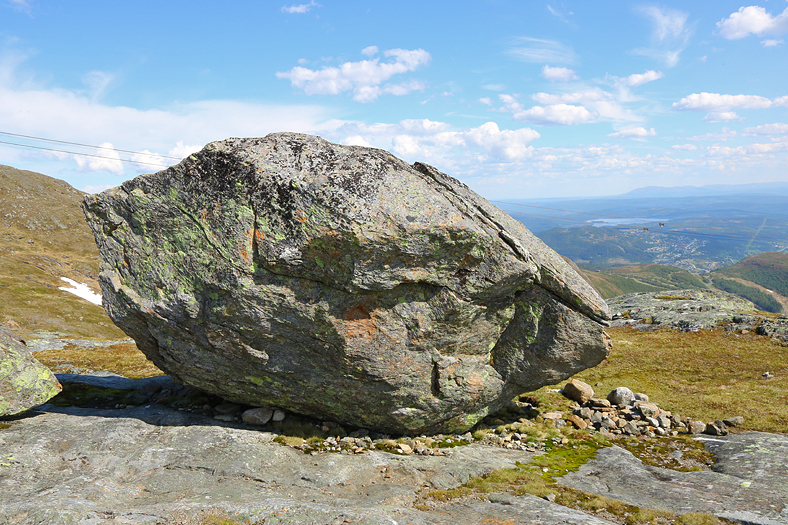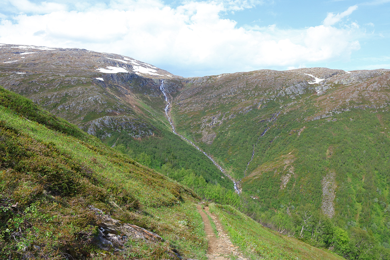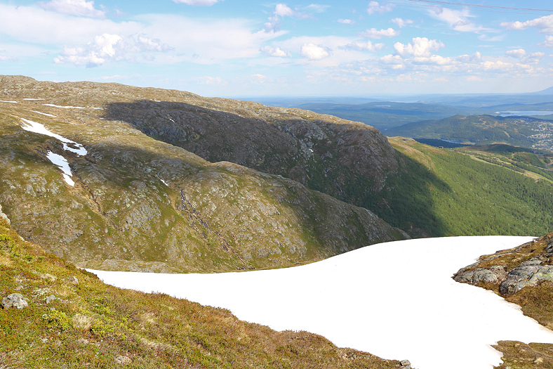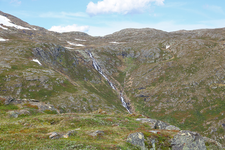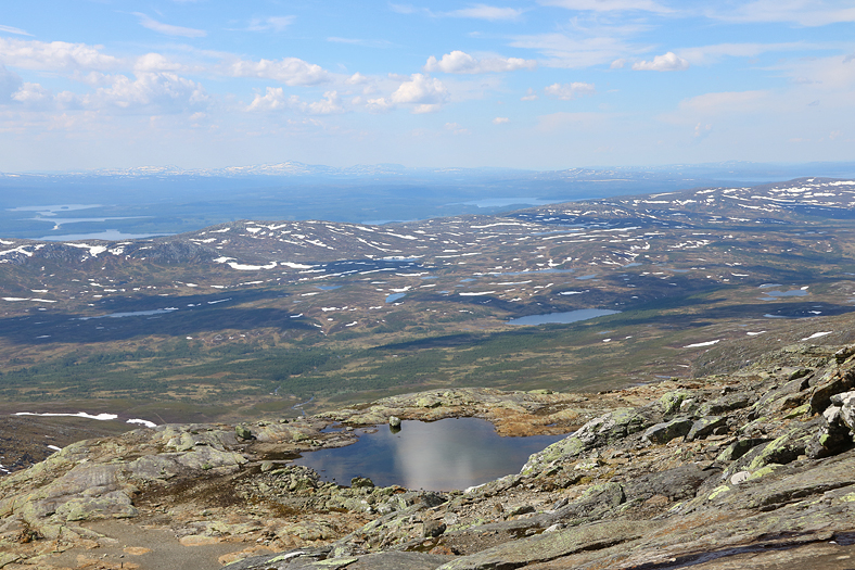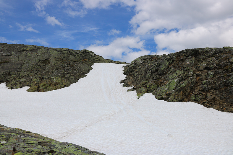 Som nämnts så låg det snölegor på flera håll i fjällområdet. Ett ställe på vägen ner var jag tvungen att passera en snölega på ca 30 meter, och för säkerhets skull i en krävande lutning. Inte på något sätt att det skulle vara farligt då det var en bra bit från något stup, men lite mer ansträngande blev det för några minuter. Och att känna på snö i mitten av juni har jag aldrig gjort förut. 😉 Efter denna lilla svårighet så mötte jag två engelskspråkiga män som undrade om vägen upp till toppen, jag förklarade att det fanns lite svårigheter från den väg jag kom. 😉 Sedan frågade jag i min iver också om det fanns fler liknande hinder på vägen ner, men de sa då nej till min lättnad. 😉