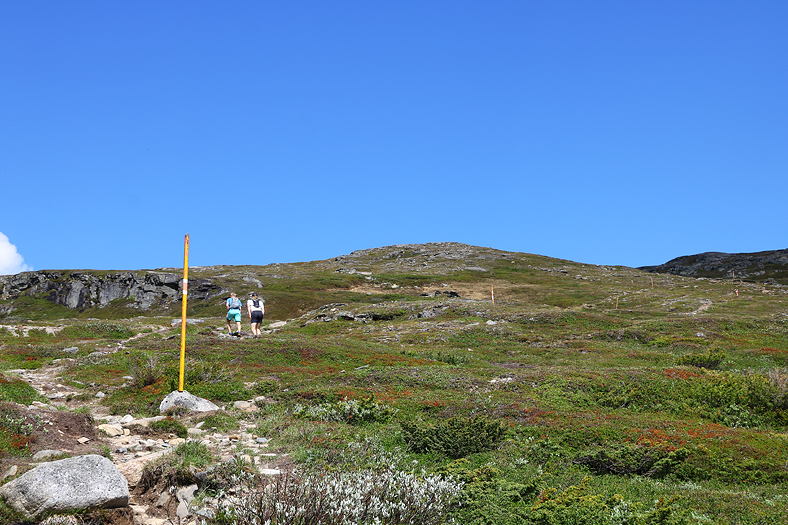 Ingen jätterusning på fjället även om det var några stycken som kom i rask takt upp längs östra leden. De uppsatta stolparna gav tydlig markering om var leden gick. Det var lite otydligt på ett ställe i skogspartiet vid Totthummeln men annars var det tydligt markerat tyckte jag.