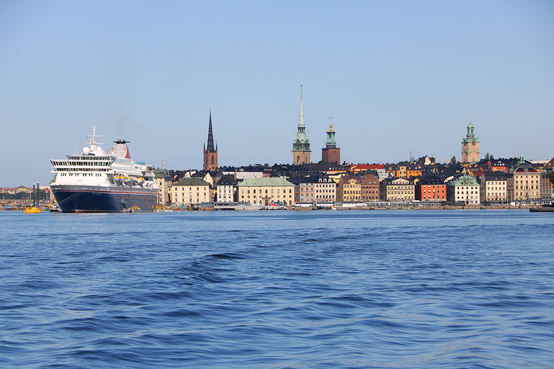 Sjöbris avgick från Strömkajen kl. 08:30 med omkring 130 passagerare ombord. Det kom på fler längs vägen. På bilden syns den vackra silhouetten av Gamla stan och med kryssningsfartyget Balmoral förtöjd på Strömmen.