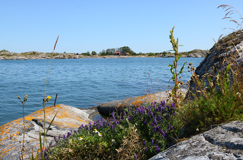 Ingen hög vegetation på Lilla Nassa direkt, men en hel del buskar och en del blomster.