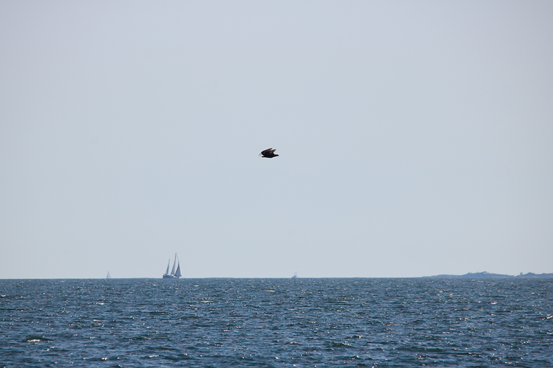 På vägen över Björkskärsfjärden, mot Möjaskärgården, så sågs havsörn på en kobbe innan den flög iväg med sina mäktiga vingslag.