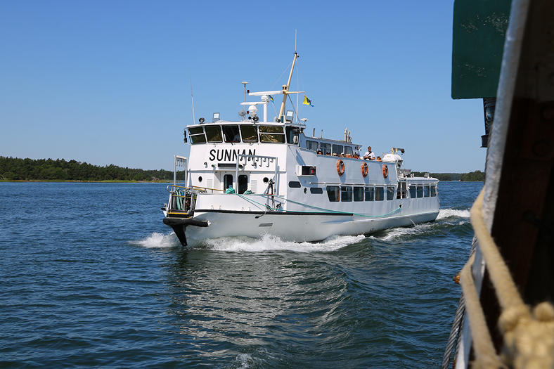 Nord-Sydlinjens nordliga fartyg, dock med sydligt namn, Sunnan passerade oss utanför Hallonstenarna i riktning mot Sandhamn. Den nordliga delen av linjen går mellan Arholma och Sandhamn, med avstickare till Stavsnäs varannan dag. Den sydliga delen utgår varannan dag från Stavsnäs, men i huvudsak dagligen från Sandhamn och ner till Nynäshamn.