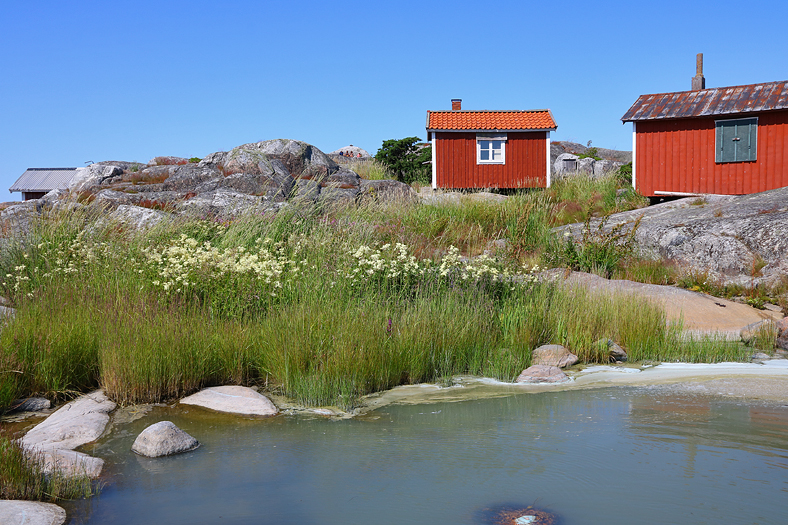 Röda sjöbodar är ett kännetecken för ytterskärgårdsmiljön med de gamla fiskelägena.