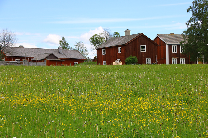 En ängsbild med vy mot Näsgården, en gårdsmiljö som skildras från tiden strax före år 1900.