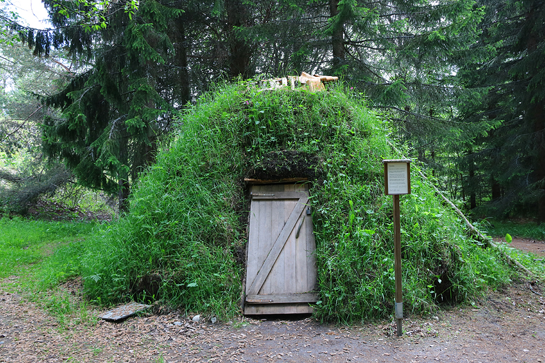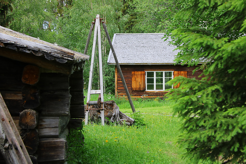 Till vänster i bilden syns en skogsarbetarkoja från Överhogdal socken i Härjedalen. Som namnet kanske skvallrar så var detta en byggnad för skogsarbetare, som under avverkningstiden (vintern) kom att vistas i dessa kojor. Koja som inte bara kan syftas på en lekplats för barn, utan också för en temporär bostad likt denna skogsarbetarkoja. Tillhörande dessa kojor fanns stall för de arbetande hästar som skulle släpa på timret, och då kan man ju snacka om hästkrafter. 😉