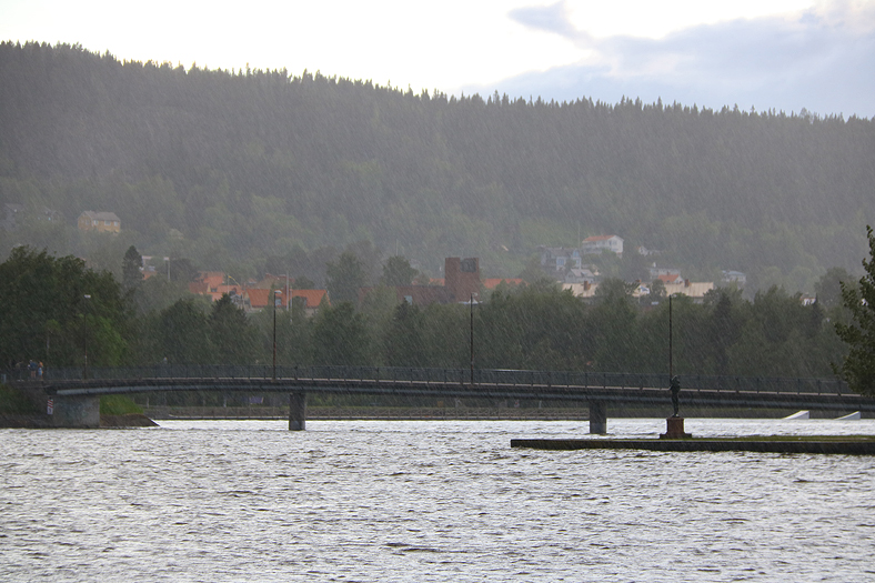 Så kom det en ordentlig skur framåt 22:30-tiden på kvällen då jag var på väg tillbaka till hotellet. Såg att Thomée, passagerarbåten, inte låg inne så jag stod en stund och väntade för att se om den eventuellt skulle komma, men tji fick jag…På bilden syns gång och cykelbron från Badhusparken över till Frösön.
