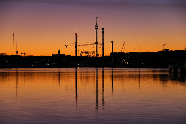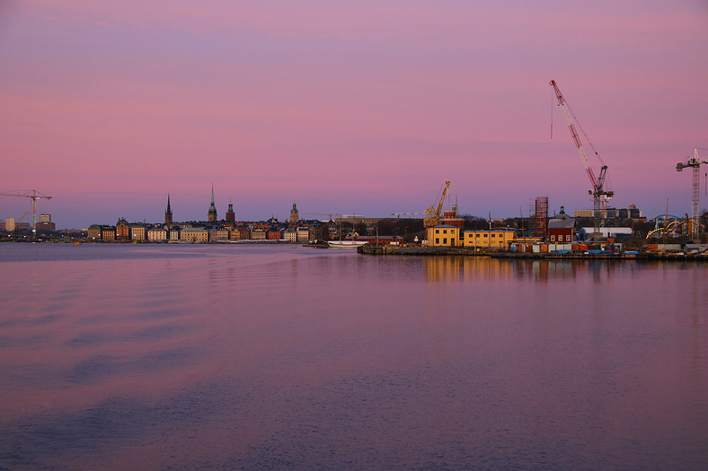 Vilken magisk morgon det blev, stilla vatten och härliga färger på himmelen. På väg mot Strömkajen blev jag tvungen att stanna upp en stund. Skulle kunna kalla denna bild för ”uppstickare” då de flertalet tornen, master och kranar verkligen sticker upp. Sedan stack ju morgonljuset ut dessutom.