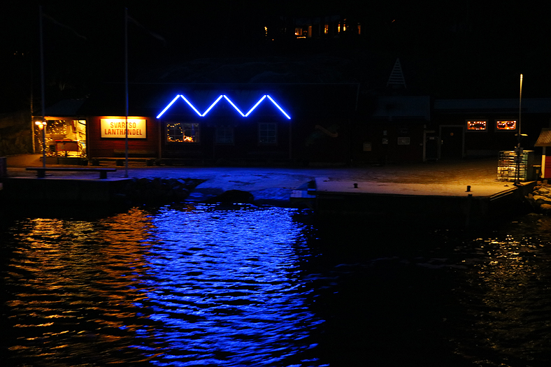 Upplyst i blått vid Svartsö lanthandel intill Alsviks brygga. En affär som servar ön och dess närområde, den byggdes ut till nuvarande storlek för 15-20 år sedan, innan var det en rätt liten affär.