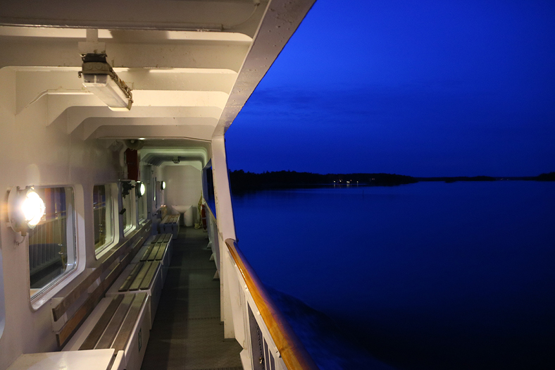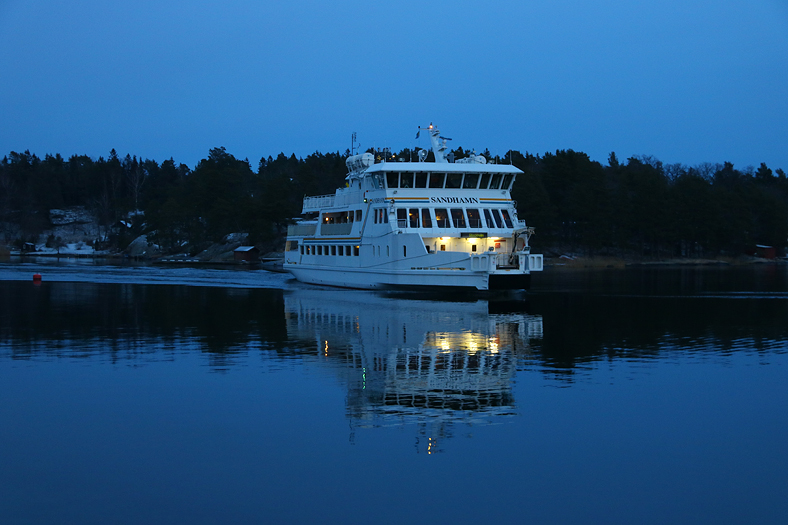 Sedan bar det in i mörkret och det blev en avkopplande resa in till Lidingö som gick via Boda, Grinda, Lindalssundet och Vaxholm. Debarkerade båten sedan vid Gåshaga ca 18:47, så bra, då hann man med 18:50-spårvagnen på Lidingöbanan. 😉