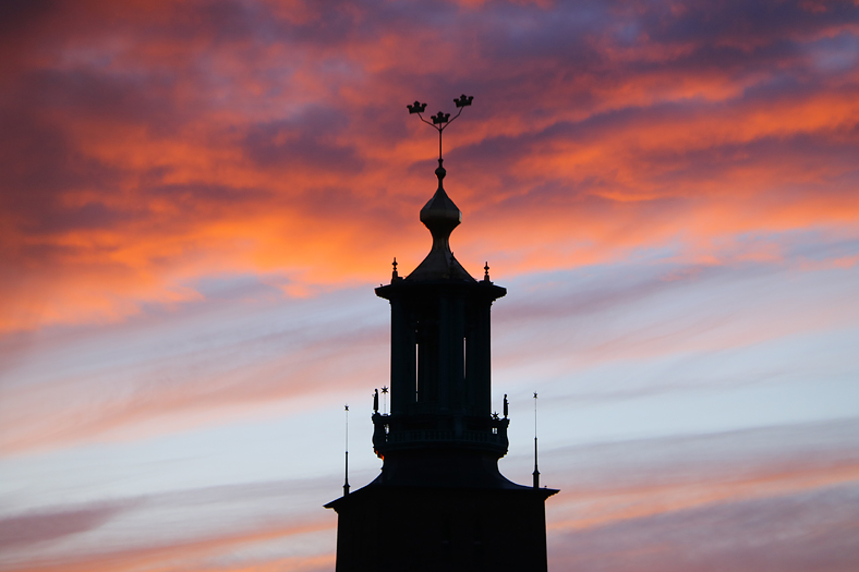 Vacker skymning blev det fredagen den 13:e mars. Kraftfullhet i Stadshustornet och aftonrodnaden, och den kraften kan behövas i dessa dagar.