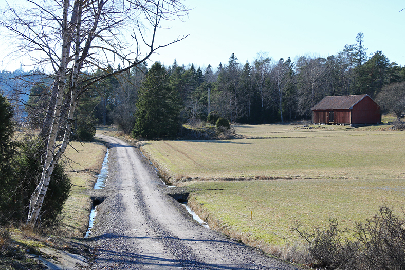 Söderut på Nämdö passeras en del öppna landskap innan mer skog tar över. På bilden syns en väg gå in till höger i bild, vid ladan, och den leder in i en stor del av naturreservatet på ön, och man kan även gå bort till en vacker insjö.