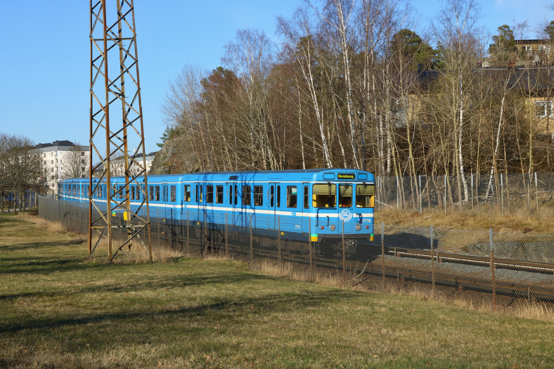 Så tog jag mig en promenad den 26 mars ifrån jobbet i Sätra till Axelsberg, via Bredäng och Mälarhöjden. På bilden syns ett äldre tunnelbanetåg mellan Bredäng och Sätra. I takt med att de nya tunnelbanetågen går in i trafik så småningom, så kommer dessa äldre tåg fasas ut.