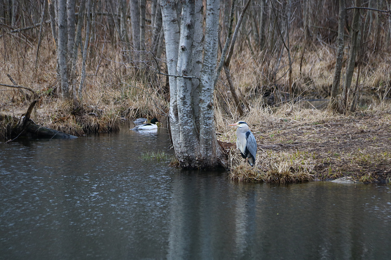 En annan del som jag stoppat tills vidare är simningen, brukar gå i alla fall två gånger i veckan till GIH-badet på Östermalm nära Tekniska Högskolan. Även fast simhallarna fortfarande håller öppet, trots rekommendationer om att undvika allmänna omklädningsrum, så känner inte jag något större intresse, behov eller lust av att gå dit just nu. Då får motionen bli promenader eller cykelturer, och där är jag till fördel van med social distansering. Min Jämtlandsresa förra året, med bland annat bestigning av Åreskutan, gjorde jag ju på egen hand. I alla fall, en promenad som jag gjorde i slutet av mars var att gå runt halva Lidingö i stort sett. Promenaden gick bland annat bort till Kottlasjöns östra del, där denna gråhäger och några storskrakar höll till.