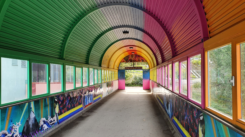 14 juli på morgonen så stack jag tidigt hemifrån Lidingö. Pendeltåget tog mig från Stockholm City till Handen, och framme i Handen så valde jag att gå av i stationens södra ände som leder mot Rudans friluftsgård bland annat, men också inte så lång gångväg till busshållplats Handenterminalen. Och gångbron från station till fast mark så att säga var minst sagt färgglad.