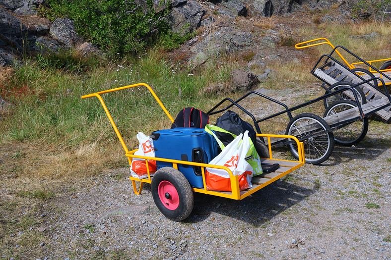 Framme på Fjärdlång var vi ca 13:30. Intill bryggan så fanns vagnar att låna för transport till vandrarhemmet eller någon annan av de byggnader på ön som används för övernattning.