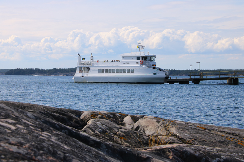 Vi gick tillbaka med vagnen till bryggan efter att ha installerat oss i stugan. Då kunde vi passa på att se Octava komma tillbaka ifrån Ornö kyrka, där hon kom att vända för tillbakaresa mot Dalarö. Octava ägs av ett lokalt rederi på Ornö och det från latin inspirerade namnet kommer av att det är det åttonde fartyget i rederiet.