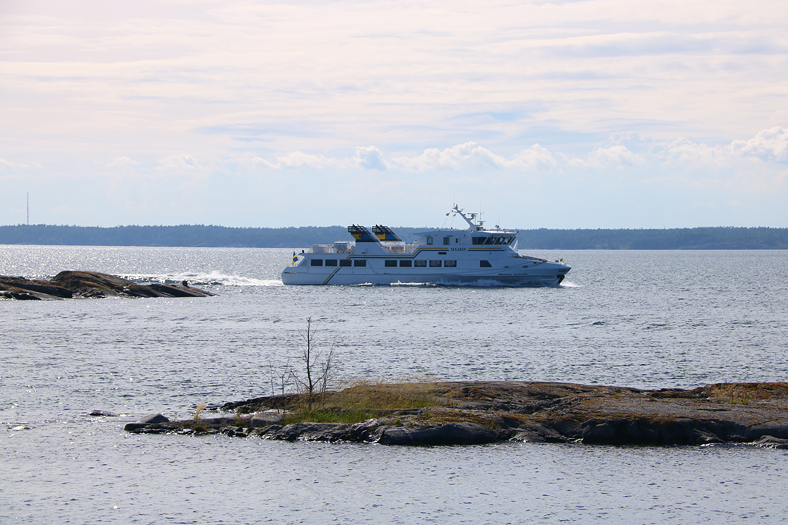 Saxaren kom från Utö dit hon under sommaren går måndag-torsdag varje vecka ifrån Strömkajen i Stockholm. Fredag-söndagar kör någon av de så kallade V-båtarna. Vi fick syn på denna norskbyggda Waxholmsbåt när vi gick en naturstig längs Fjärdlångs södra del.
